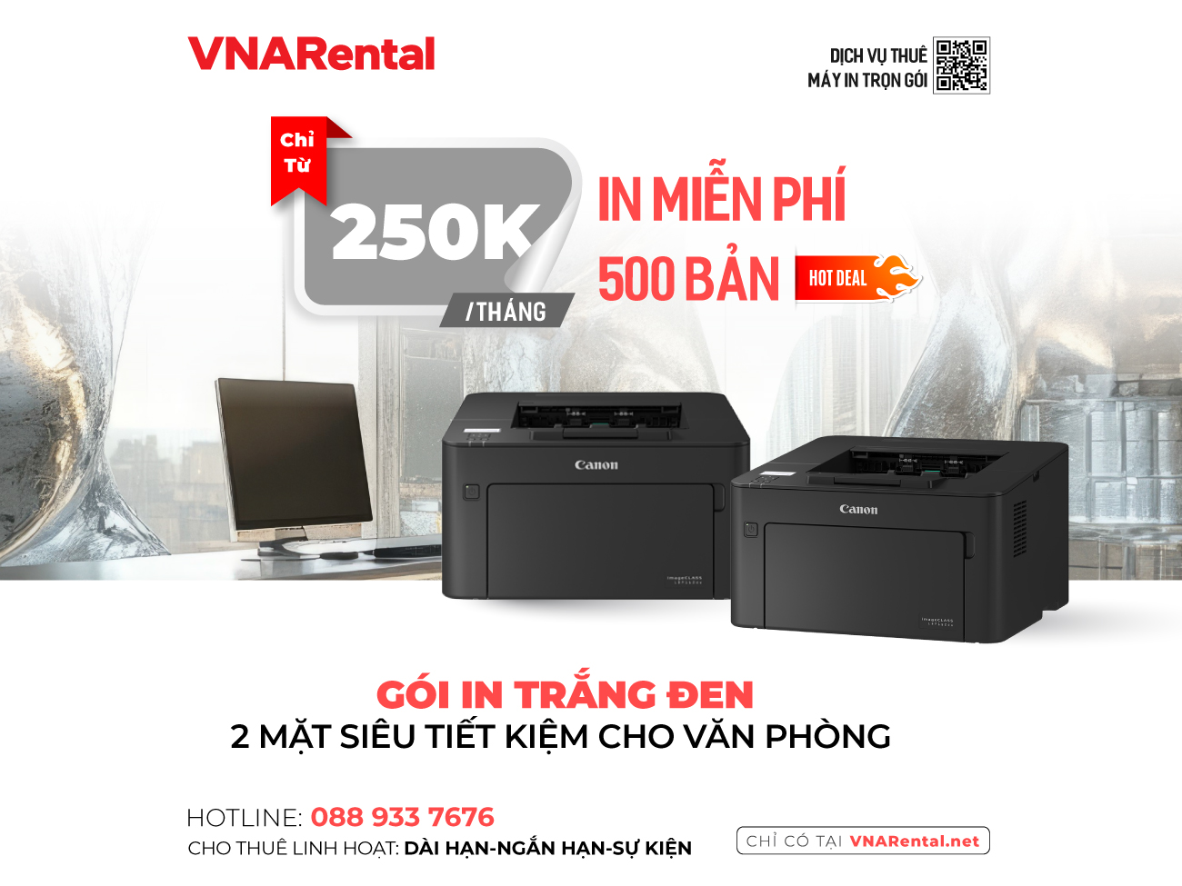 VNARental là đối tác đáng tin cậy cung cấp dịch vụ cho thuê máy in 2 mặt giá rẻ và chuyên nghiệp tại Việt Nam. Chúng tôi cam kết mang đến giải pháp tối ưu cho doanh nghiệp và cá nhân, giúp tiết kiệm chi phí đầu tư ban đầu, tối ưu hóa quy trình in ấn và nâng cao hiệu quả công việc. Đặc biệt, giá thuê chỉ từ 250K/ tháng, khách hàng được miễn phí 500 bản in đầu tiên. Thông tin chi tiết, mời bạn cùng tìm hiểu qua bài viết sau đây.  Tại VNARental, chúng tôi có dịch vụ cho thuê máy in 2 mặt giá rẻ, uy tín, chuyên nghiệp. 1. Giải pháp tối ưu với dịch vụ cho thuê máy in 2 mặt In ấn tài liệu hai mặt là nhu cầu thiết yếu của doanh nghiệp, văn phòng và cả cá nhân làm việc tại nhà. Với dịch vụ thuê máy in 2 mặt từ VNARental, bạn sẽ nhận được những lợi ích vượt trội: Tiết kiệm chi phí đầu tư ban đầu: Không cần bỏ ra hàng chục triệu để mua máy mới, chỉ với khoản phí thuê hợp lý hàng tháng, bạn đã có ngay thiết bị hiện đại phục vụ trọn vẹn nhu cầu in ấn. Giảm thiểu rủi ro và chi phí bảo trì: Máy in luôn được VNARental bảo dưỡng, thay thế linh kiện kịp thời, giúp bạn yên tâm sử dụng mà không phát sinh thêm chi phí. Tối ưu hiệu quả và tiết kiệm: In hai mặt giúp giảm 50% lượng giấy, cắt giảm chi phí văn phòng phẩm và góp phần bảo vệ môi trường. Tiện lợi, nâng cao năng suất: Máy in 2 mặt tự động loại bỏ thao tác lật giấy thủ công, tiết kiệm thời gian cho nhân viên, tối ưu hiệu quả công việc. Tại VNARental, chúng tôi thiết kế dịch vụ thuê máy in 2 mặt nhằm giúp doanh nghiệp vừa tiết kiệm, vừa vận hành in ấn linh hoạt và bền vững. 2. Vì sao nên chọn dịch vụ thuê máy in 2 mặt tại VNARental? VNARental tự hào là đơn vị cung cấp dịch vụ cho thuê máy in hàng đầu, mang đến sự khác biệt thông qua các cam kết và quyền lợi độc quyền: Giá thuê cạnh tranh chỉ từ 250K/ tháng và chính sách ưu đãi linh hoạt: Chúng tôi cung cấp mức giá thuê máy in 2 mặt tốt nhất thị trường, phù hợp với mọi ngân sách. Đặc biệt, chính sách thuê càng lâu, giá càng ưu đãi chỉ từ 250K/ tháng (gói in trắng đen) giúp bạn tiết kiệm tối đa chi phí. Bạn có thể lựa chọn gói thuê theo tháng, theo quý, hoặc theo năm tùy thuộc vào nhu cầu sử dụng. Giao & lắp đặt tận nơi trên toàn quốc: Dù bạn ở bất kỳ đâu trên lãnh thổ Việt Nam, VNARental đều hỗ trợ giao và lắp đặt máy in tận nơi. Đội ngũ kỹ thuật viên chuyên nghiệp của chúng tôi sẽ có mặt để cài đặt, kết nối và kiểm tra máy, đảm bảo thiết bị hoạt động trơn tru ngay sau khi bàn giao. Hỗ trợ kỹ thuật và hướng dẫn tận tình: Khi thuê máy in tại VNARental, bạn sẽ được hướng dẫn sử dụng chi tiết từ A đến Z. Trong suốt quá trình thuê, nếu có bất kỳ vấn đề kỹ thuật nào, bạn chỉ cần liên hệ, đội ngũ hỗ trợ của chúng tôi sẽ nhanh chóng giải quyết. Chúng tôi cam kết xử lý sự cố nhanh chóng, không làm gián đoạn công việc của bạn. Bảo dưỡng, vệ sinh và thay mực miễn phí: Đây là một trong những lợi ích nổi bật nhất khi sử dụng dịch vụ của VNARental. Chúng tôi sẽ định kỳ vệ sinh, chăm sóc và bảo dưỡng máy in hoàn toàn miễn phí, giúp máy luôn hoạt động ở trạng thái tốt nhất. Đồng thời, khi hết mực, chúng tôi sẽ thay mực chính hãng miễn phí, đảm bảo chất lượng bản in sắc nét, rõ ràng. Xử lý sự cố, sửa chữa và thay linh kiện không tốn phí: Trong trường hợp máy gặp sự cố, bạn không cần phải lo lắng về chi phí sửa chữa. VNARental cam kết sửa chữa, thay thế linh kiện hỏng hóc mà bạn không phải tốn bất kỳ chi phí nào. Điều này giúp bạn loại bỏ hoàn toàn gánh nặng tài chính và sự phiền toái khi máy in gặp trục trặc. Tại VNARental, bạn chỉ cần thuê máy và yên tâm sử dụng, các việc khác đã có VNARental xử lý. 3. Gợi ý các dòng máy in 2 mặt phổ biến nên thuê Để đáp ứng nhu cầu in ấn hai mặt nhanh chóng, tiết kiệm và chuyên nghiệp, VNARental giới thiệu một số dòng máy Canon trắng đen được trang bị tính năng in hai mặt tự động. Đây đều là những lựa chọn bền bỉ, hiệu suất ổn định, phù hợp cho nhiều loại hình doanh nghiệp và văn phòng: Canon imageCLASS MF271dn: Máy đa chức năng (in, copy, scan) với khả năng in hai mặt tự động, tốc độ in 29 trang/ phút. Thiết kế nhỏ gọn, dễ sử dụng, phù hợp cho văn phòng vừa và nhỏ muốn tối ưu chi phí vận hành. Canon imageCLASS LBP122dw: Máy in đơn năng trắng đen, hỗ trợ in hai mặt tự động và kết nối không dây. Đây là lựa chọn lý tưởng cho doanh nghiệp cần một thiết bị in ấn gọn nhẹ, hiệu suất ổn định. Canon imageCLASS LBP162dw: Dòng máy đơn năng nhỏ gọn, có khả năng in hai mặt tự động với tốc độ 28 trang/ phút. Thiết kế tinh giản nhưng mạnh mẽ, rất thích hợp cho không gian làm việc hạn chế diện tích. Canon imageCLASS MF249dw: Máy đa chức năng “tất cả trong một” (in, copy, scan, fax), trang bị in hai mặt tự động, tốc độ cao và kh